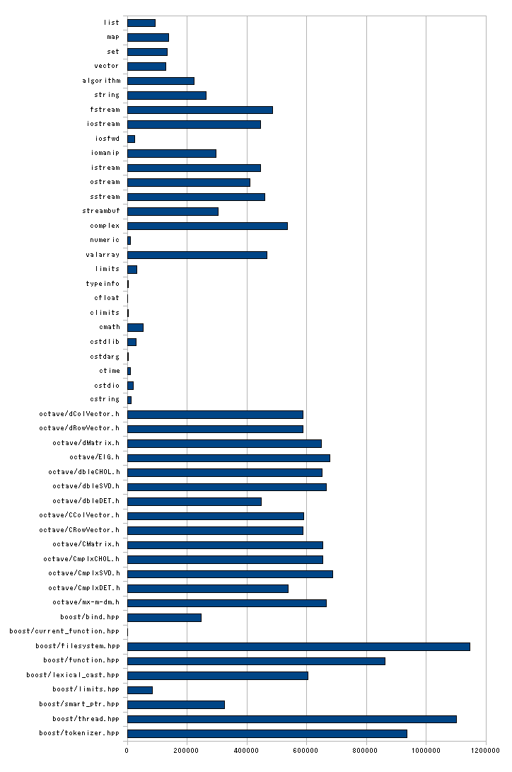 を書いて,-E を付けて g++ でコンパイルし(プリプロセッサの処理のみ行う),出力される文字数を比較した.要するに,include されるファイルをすべて展開した結果の文字数(==コンパイルに掛けられる文字数)での比較だ.もちろん template の処理とか,内容によってコンパイル時間が違ってくるので,「コンパイルに掛けられる文字数」と「コンパイル時間」は必ずしも比例しない.が,ひとつの目安にはなると思う.