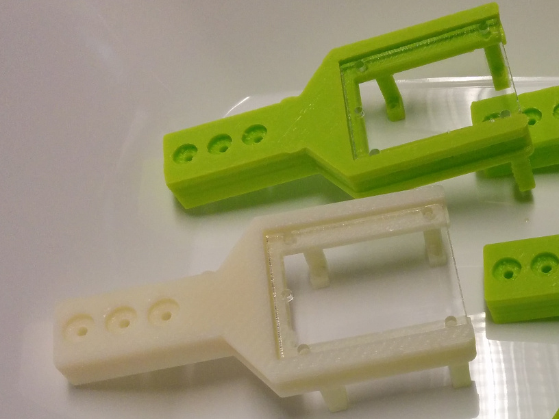 (White: New frame. Green: 3D printed frame with LulzBot.) - Silicone: Gummy Cast by Nisshin Resin (日新レジン) that has hardness durometer A 20 after cure (slightly harder than XP-565 (A 16)).