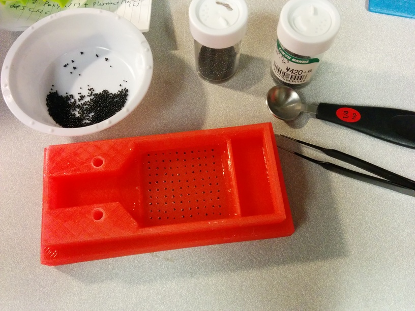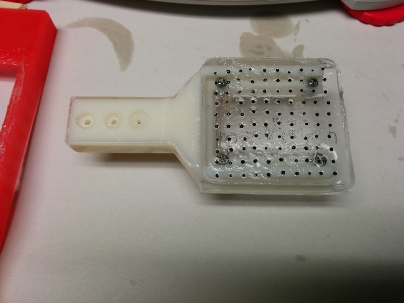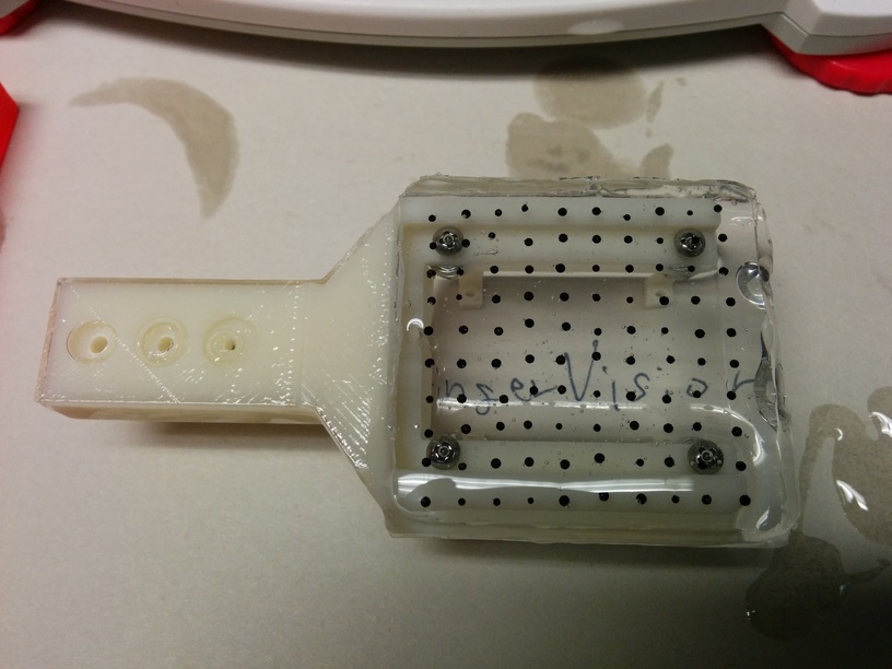 As the replacement of ComposiMold, we also use a 3D printed mold coated with Plastruct Plastic Weld. Since the surface of the mold covered by Plastruct Plastic Weld is slippery, it cannot hold the markers (markers move when pouring silicone into the mold). So,