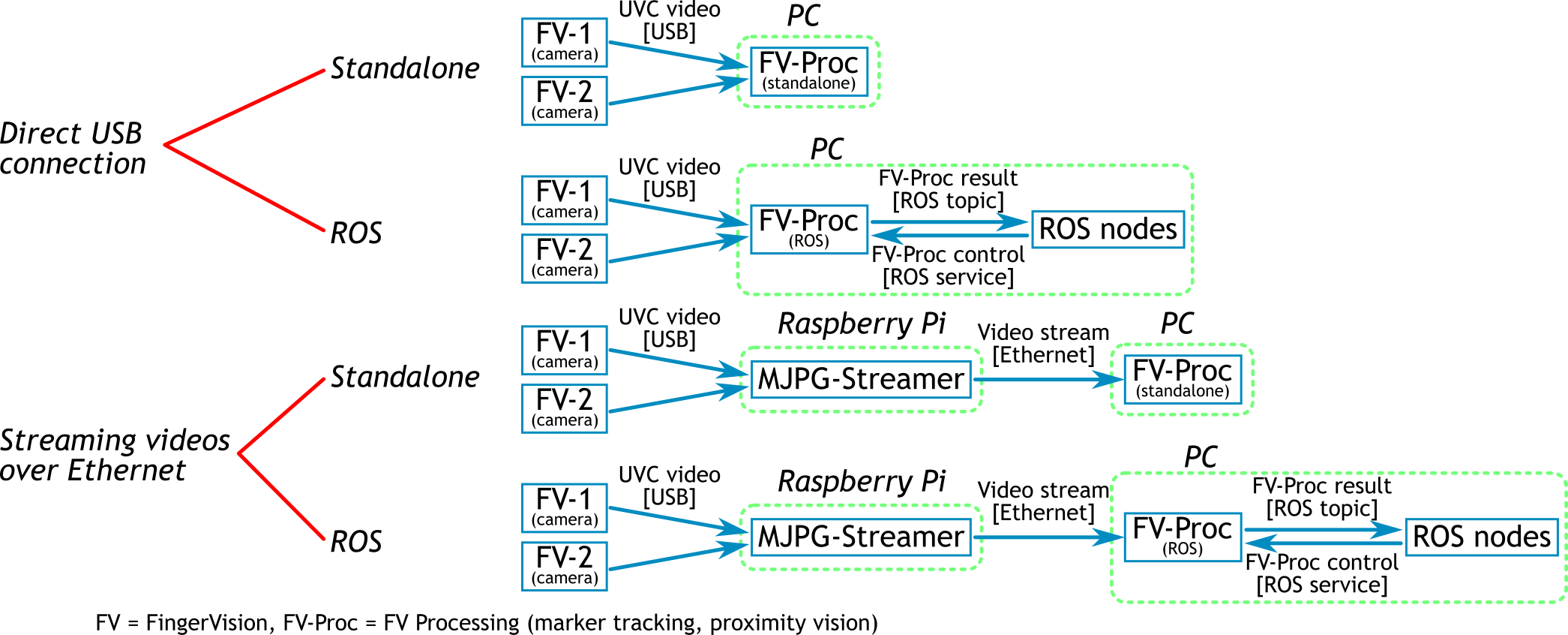 The system architecture of FingerVision has four kinds; two connection types, and two interface types. The connection types are direct USB connection and streaming video over Ethernet network. The interface types are standalone and ROS (robot operating system). These four kinds are illustrated in the following figure.