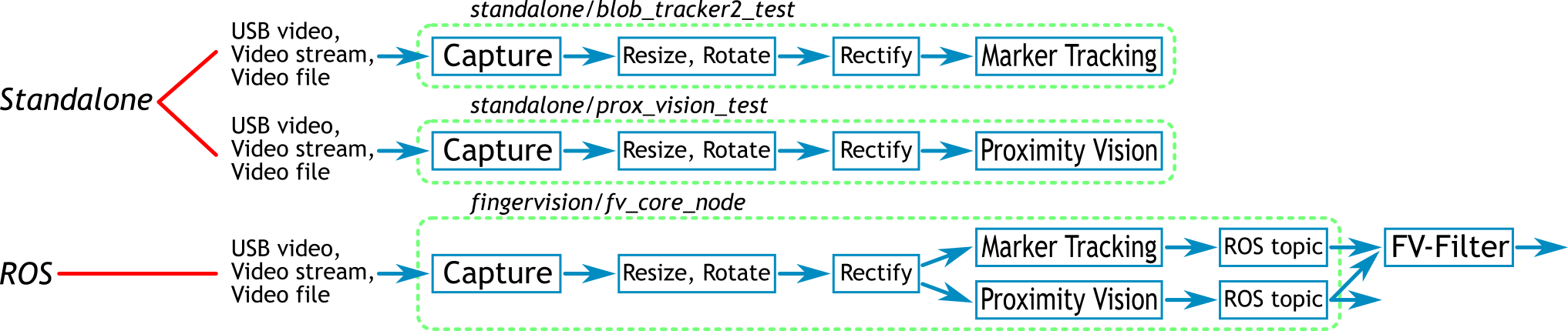 - The marker tracker and the proximity vision are designed to be general; the output of them is a kind of low-level values. FV-Filter converts these values to ones that are easy to use in control. For example, the marker movements are converted to the force estimate.